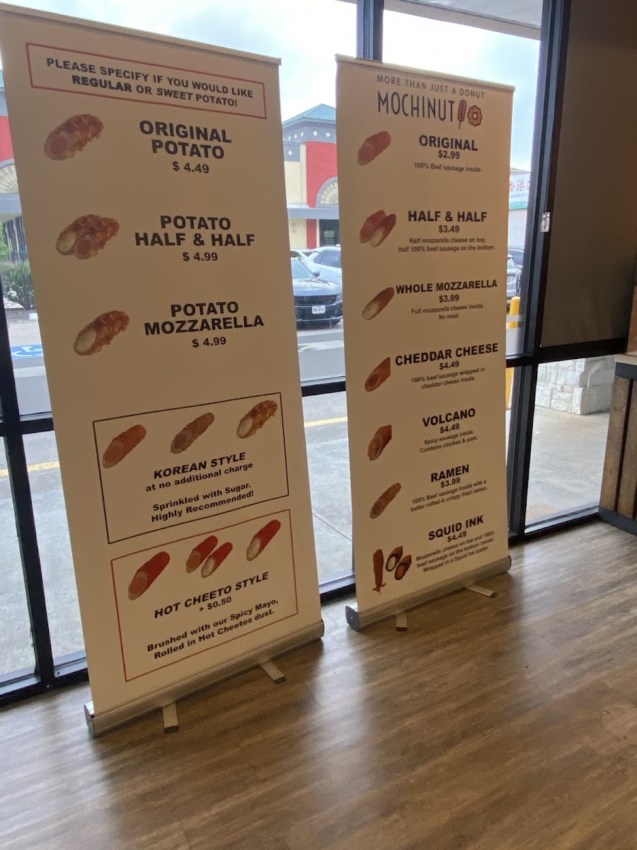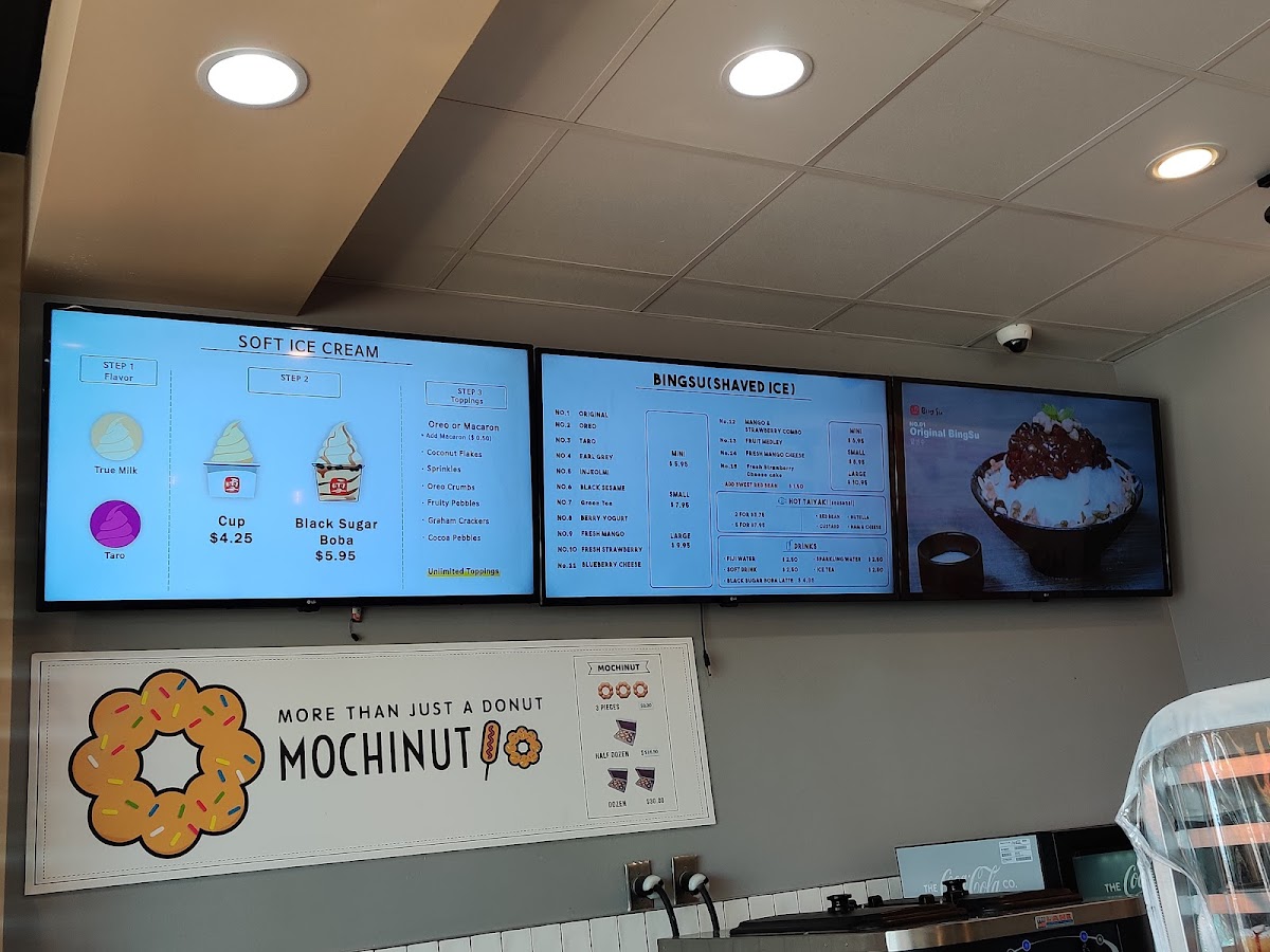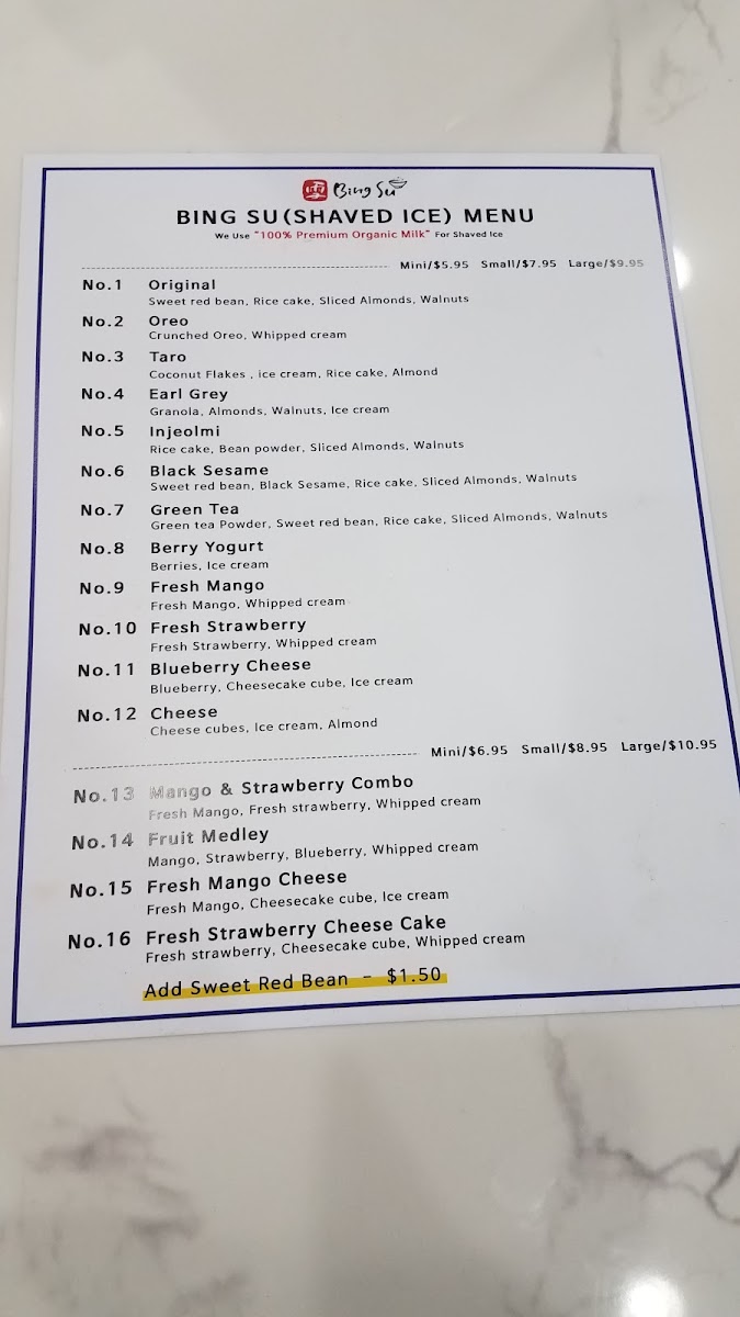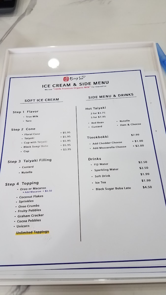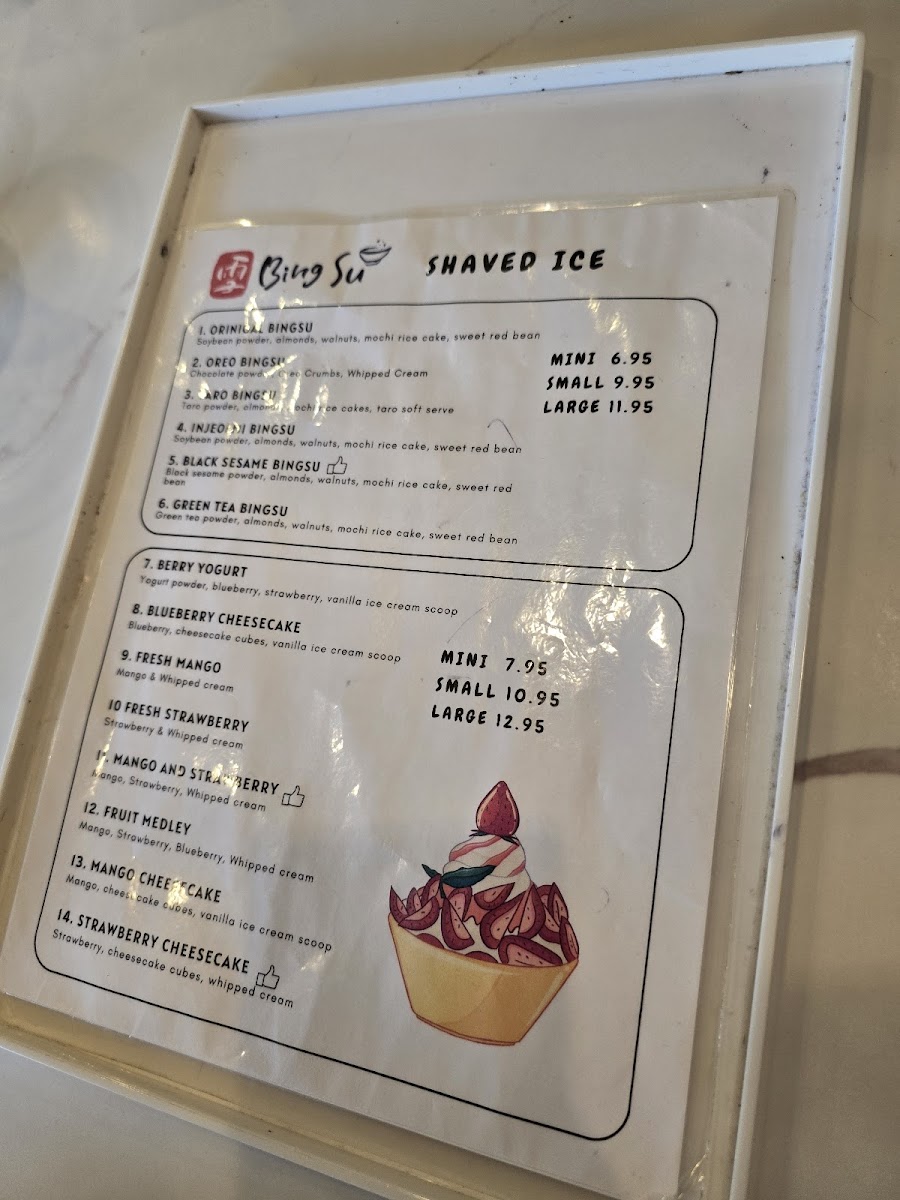 For dessert and lighter treats, the menu features mochi donuts and soft ice cream with various toppings such as black sugar boba, taiyaki, and oreo. There are also traditional Korean desserts like Strawberry Cheesecake Bing Su and Mango Tea-themed bingsu options.