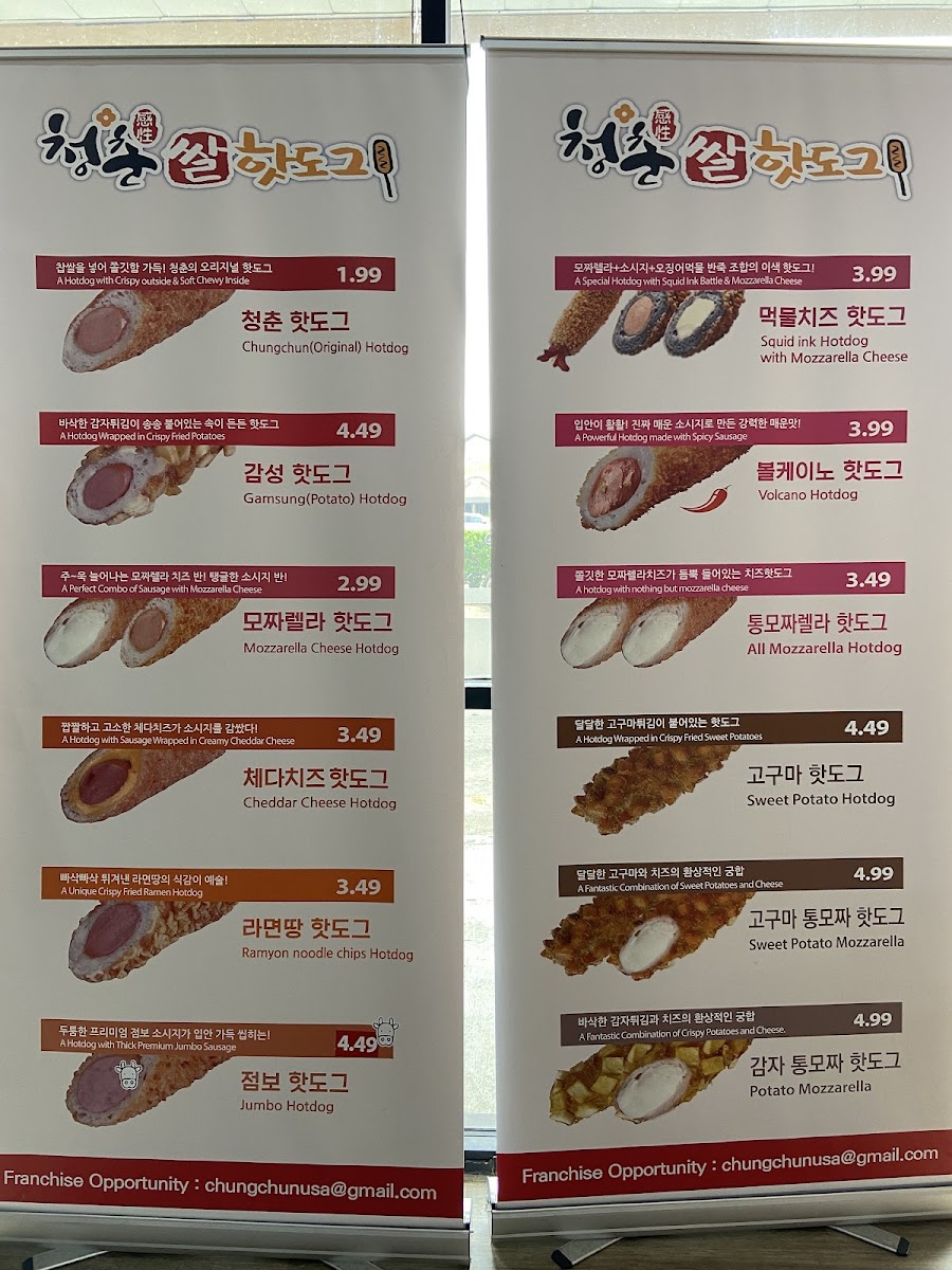 The menu at Chung Chun offers a variety of Korean-style hot dogs and cafe items, suitable for casual dining, quick meals, or light snacks. The food selections focus primarily on different hot dog variations, including the Original Hotdog with a crispy exterior and soft interior, the Gamsung Potato Hotdog wrapped in fried potatoes, Mozzarella Cheese Hotdog, and Cheddar Cheese Hotdog. Additional savory options include Ramyon Noodle Chips and other specialty hot dogs.